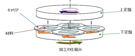 当社の加工機は、製品を下定盤と上定盤の間に挟んで、加圧且つ回転運動により研磨加工を行う機構です。その場合、製品を保持するための加工治具(当社ではキャリアと呼んでいます)が必要となります。